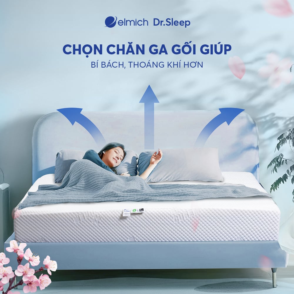 Trong thời tiết nồm ẩm, việc chọn chất liệu chăn ga gối phù hợp sẽ giúp giấc ngủ dễ chịu hơn rất nhiều. Cotton, Tencel, Sateen là những chất liệu lý tưởng vì chúng có khả năng thấm hút mồ hôi tốt, thoáng khí và không bám ẩm. Đặc biệt, các loại chăn ga đạt chuẩn OEKO-TEX® STANDARD 100 như Elmich Dr.Sleep sẽ giúp hạn chế nấm mốc, vi khuẩn phát triển trong thời tiết ẩm ướt. Hãy tránh các loại chăn ga quá dày hoặc vải kém chất lượng vì chúng có thể giữ ẩm, gây bí bách và khó chịu khi ngủ.